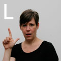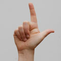 Handfläche von Körper weg, Zeigefinger nach oben, Daumen nach links, restliche Finger auf der Handfläche |