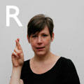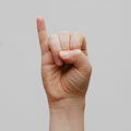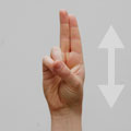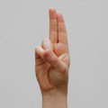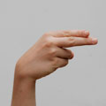 geschlossene Hand vom Körper weg, Zeige- und Mittelfinger zusammen nach oben, Daumen auf der Handfläche |
