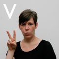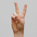 geschlossene Hand vom Körper weg, Zeige- und Mittelfinger gespreizt nach oben, Daumen auf der Handfläche |
