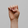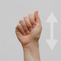 geschlossene Faust vom Körper weg, Daumen an der Seite angelegt, kurze Bewegung der Hand nach unten |
