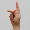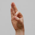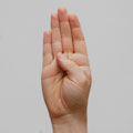 Handfläche nach unten, Zeigefinger nach vorn, Mittelfinger nach unten, Daumen berührt den Mittelfinger, restliche Finger auf der Handfläche |