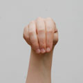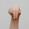 geschlossene Faust vom Körper weg, Daumen an der Seite angelegt |