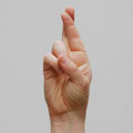 geschlossene Hand von Körper weg, Zeige- und Mittelfinger zeigen gekreuzt nach oben |