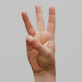 flache Hand vom Körper weg, Zeige-, Mittel- und Ringfinger gespreizt nach oben, Daumen auf der Handfläche |