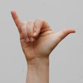 geschlossen Hand vom Körper weg, Daumen und kleiner Finger nach oben abgespreizt |